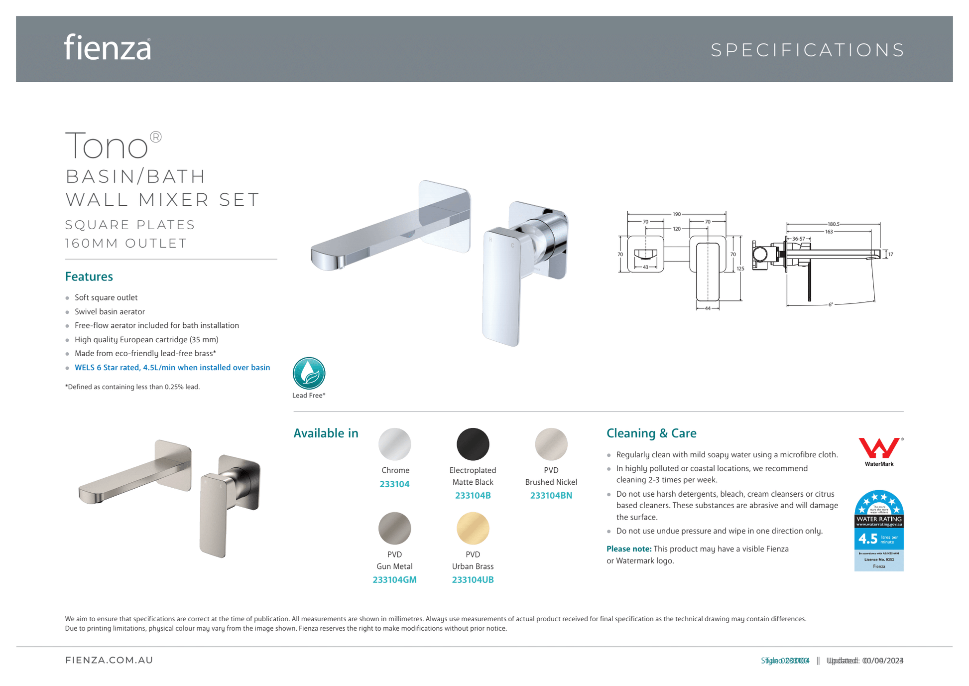 WELS 6 Star rated, 4.5L/min when installed over basin